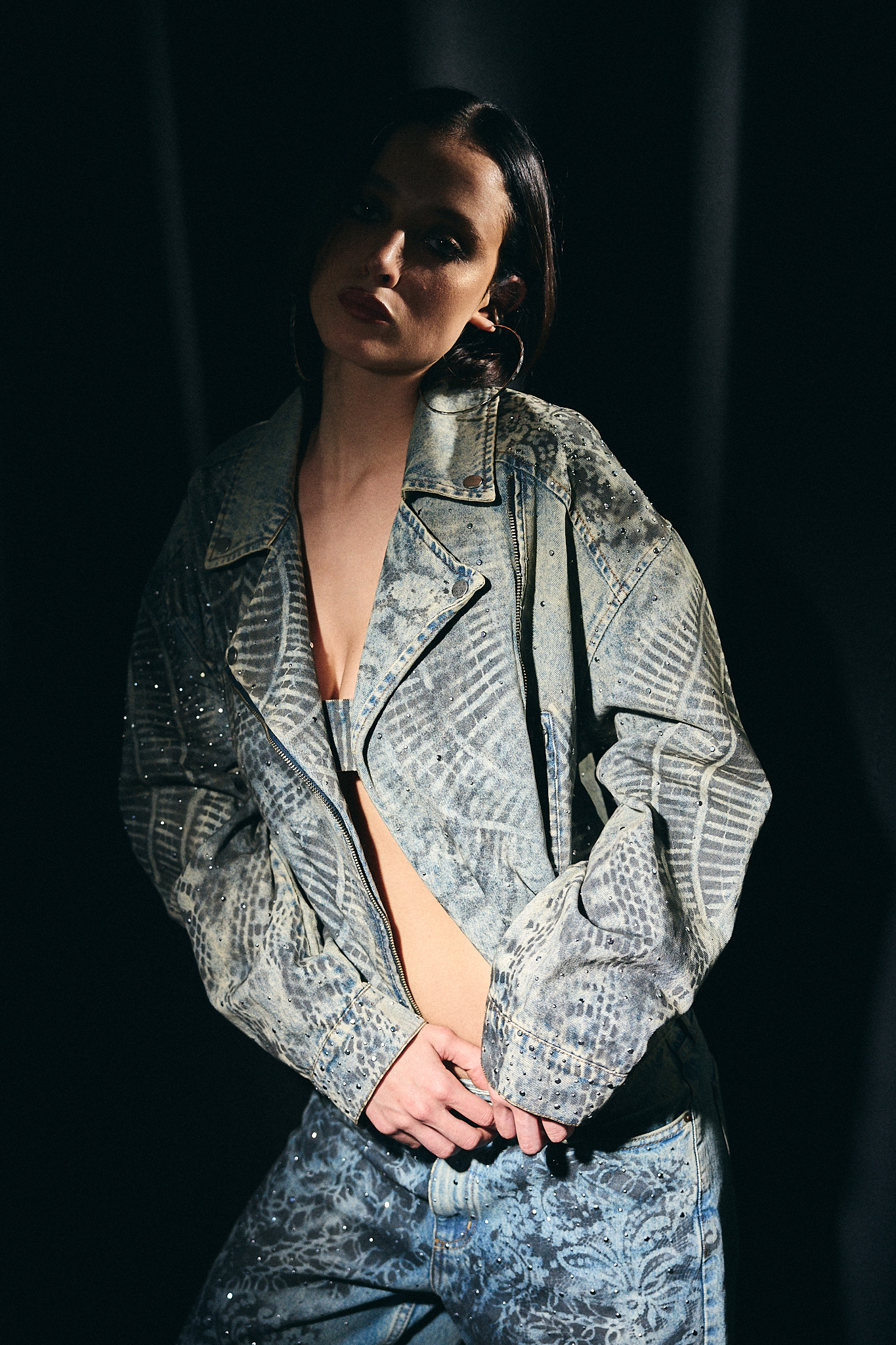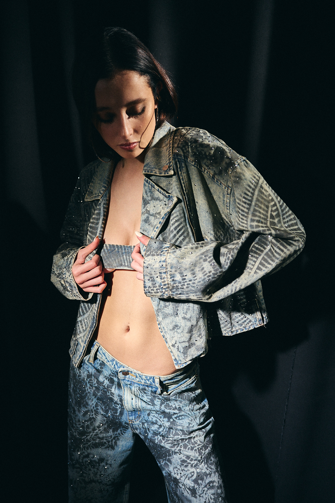 Campera de denim rigido 100% algodon, pintada a mano con aerosoles con strass brillos color negro. Dibujo de logo LS en espalda centrado.