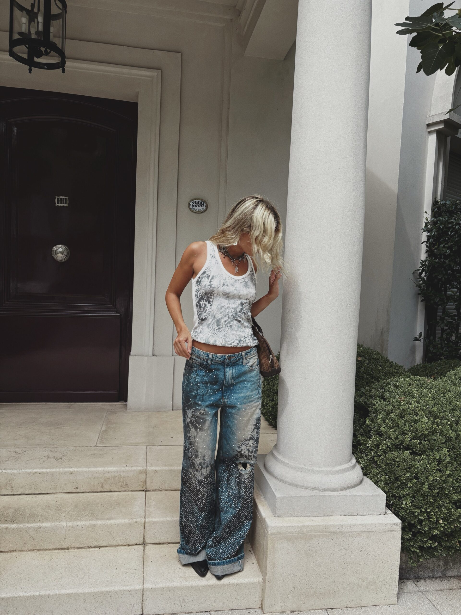 Jean Olivia talle 38, denim rígido con una variedad de piedras plateadas.