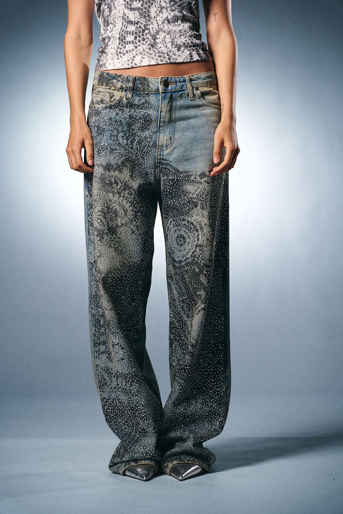 Jean whtiney pintado a mano. Pieza unica, con brillos color plata.